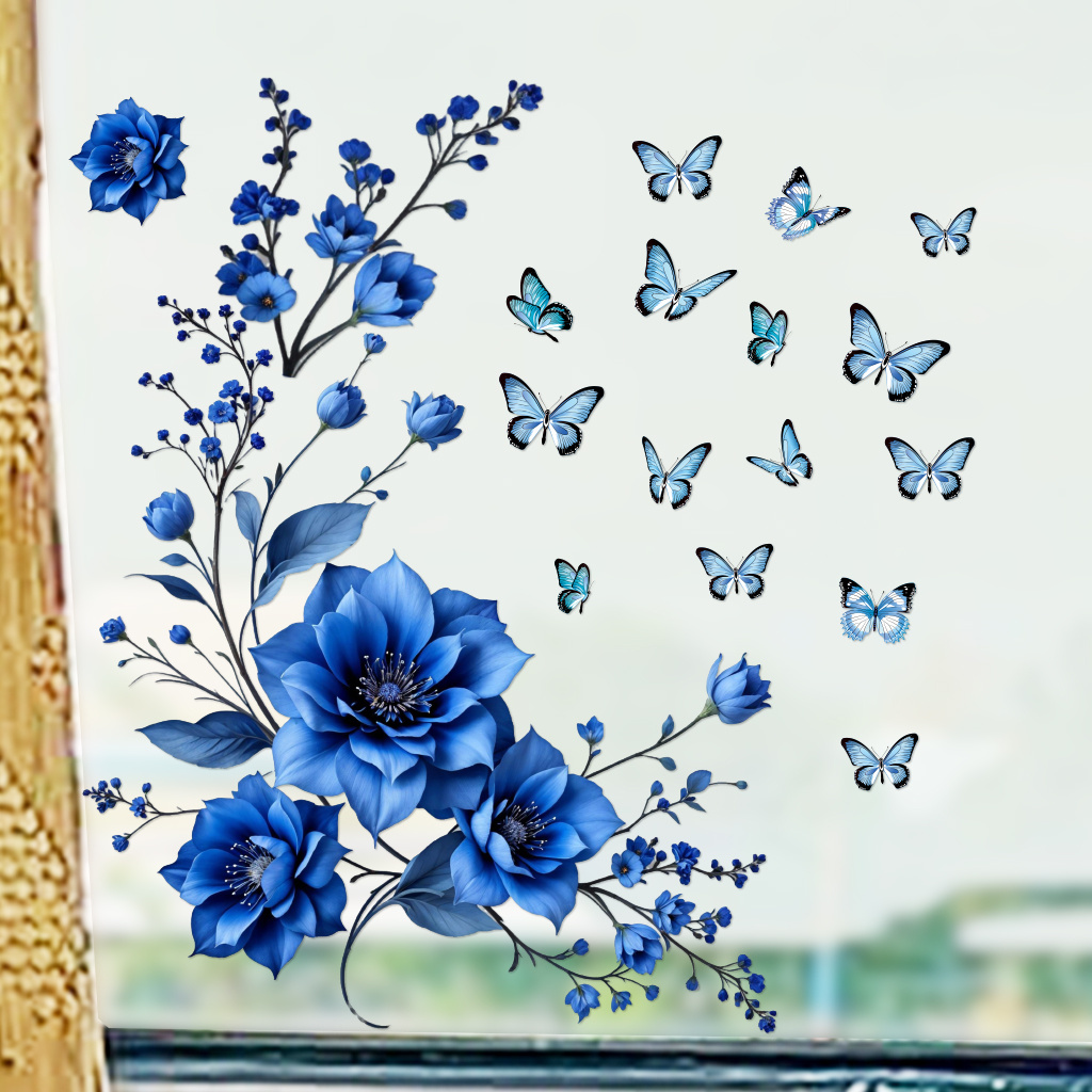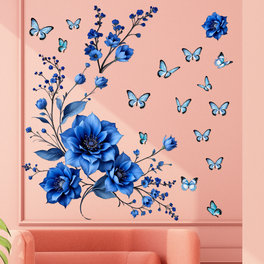 1套 轻奢蓝调花蝶墙贴,深海蓝花卉配同色系蝴蝶,风格雅致高级,贴于卧室、玄关,为空间添静谧优雅氛围与艺术格调。