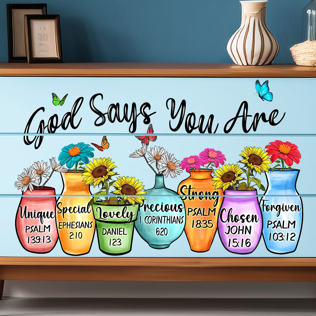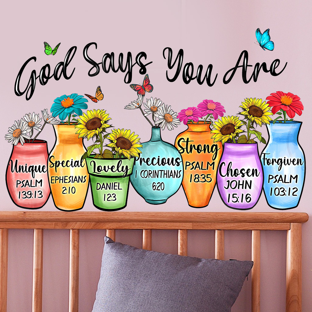 1套 信仰系圣经箴言花瓶墙贴,多彩花瓶配花卉,印 “God Says You Are” 及圣经经文,贴于书房、祷告区,为空间添信仰温馨氛围与励志格调。
