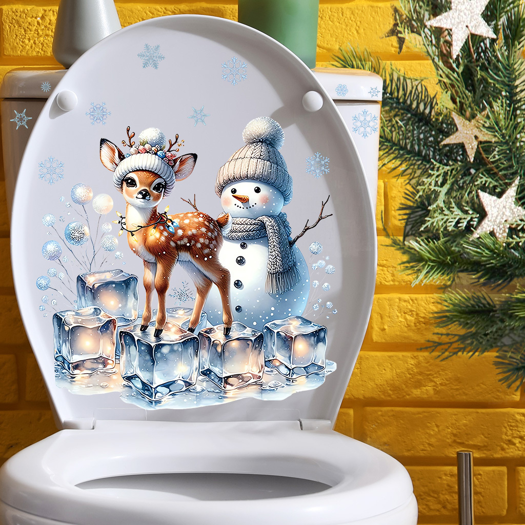 1套 冰系圣诞萌友马桶贴,冰晶小鹿与雪人组合,清新冷冽,贴于马桶盖,为卫浴添冬日圣诞氛围,自粘易贴防水耐脏。
