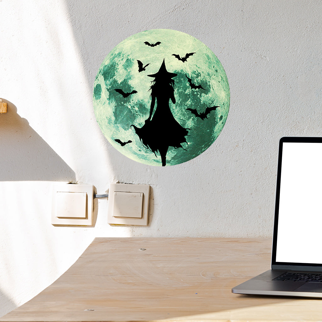 1套 夜光墙贴:万圣节主题绿月巫女蝙蝠贴饰,荧光魔法营造诡谲奇幻夜,女巫剪影与蝙蝠环绕满月,为空间注入神秘万圣氛围,乙烯基可拆卸家居装饰贴纸