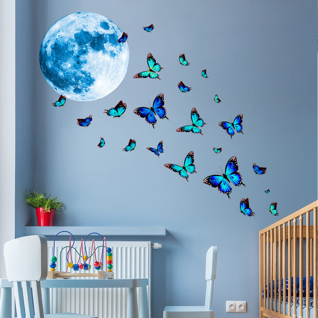 1套 夜光墙贴:蓝月蝶舞点亮卧室,荧光蝴蝶与月球组合贴饰,营造梦幻静谧夜境,为睡眠空间注入浪漫仙气,会发光的贴纸,乙烯基可拆卸家居装饰贴纸
