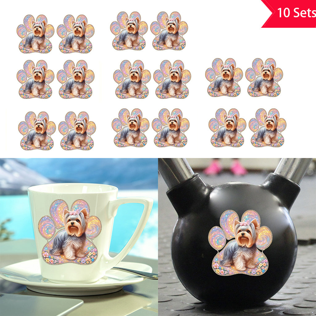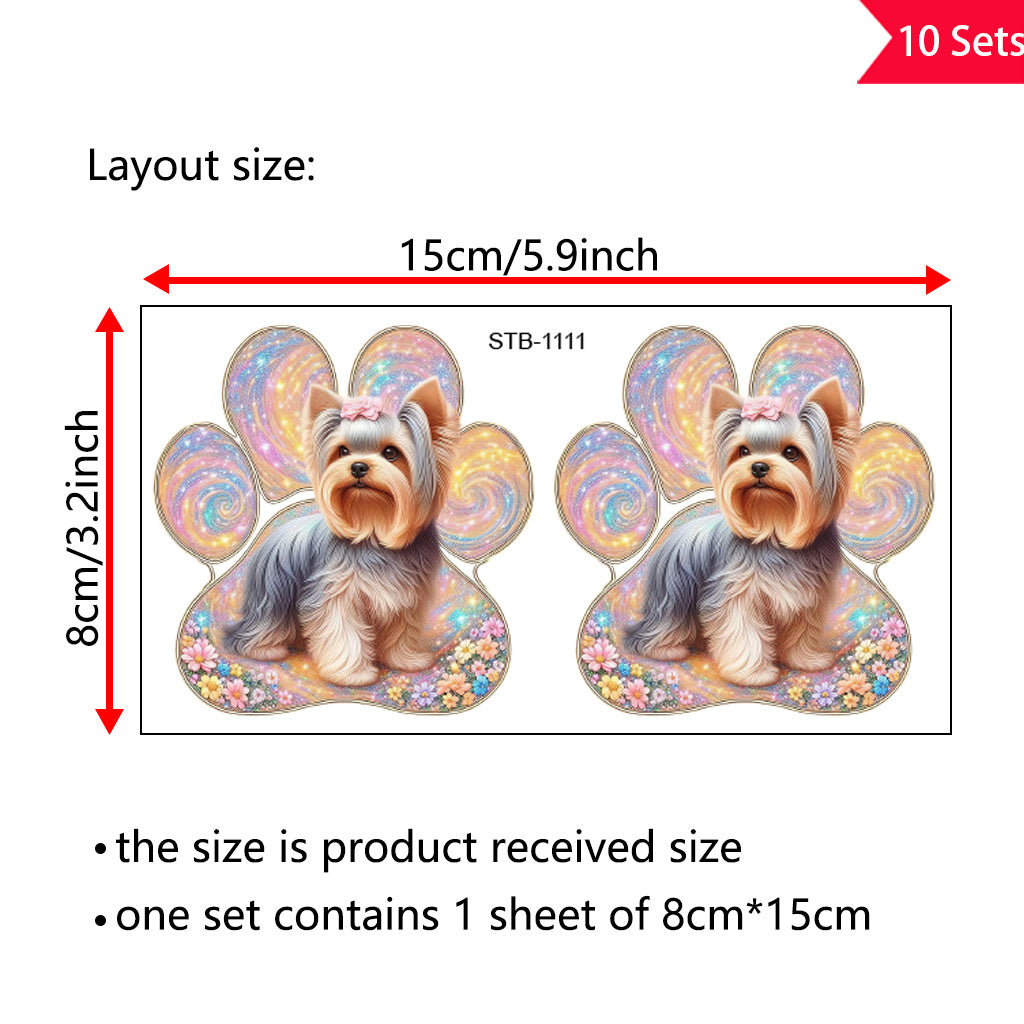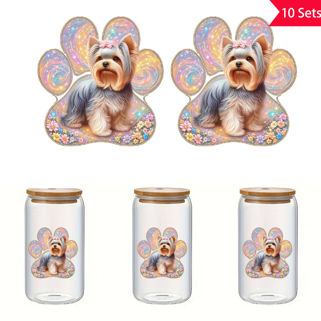 10套 可爱约克夏犬彩色狗爪印UV DTF水晶标签转印贴纸套装 - 花卉与闪亮设计,为宠物爱好者增添温馨氛围,适用于玻璃罐和空间装饰,物品装饰,自粘,可移除,防水创意DIY水晶标签转印贴纸