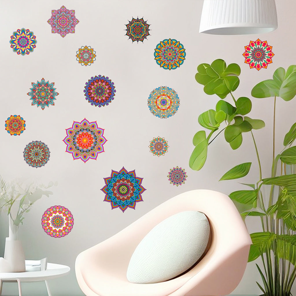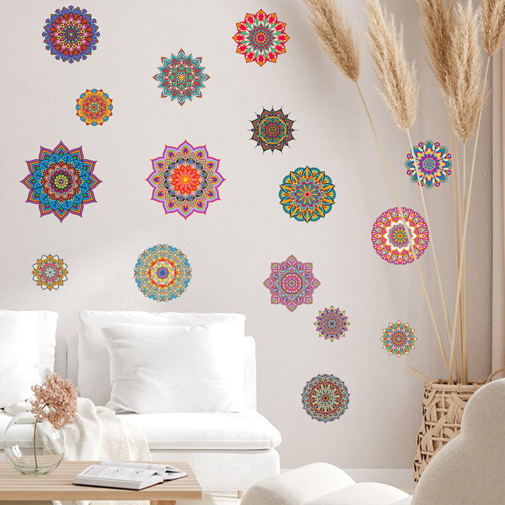 1套 曼陀罗艺术组合墙贴,黑白线稿与多彩曼陀罗图案集合,风格神秘雅致,贴于书房、卧室,为空间添艺术冥想氛围与视觉层次。
