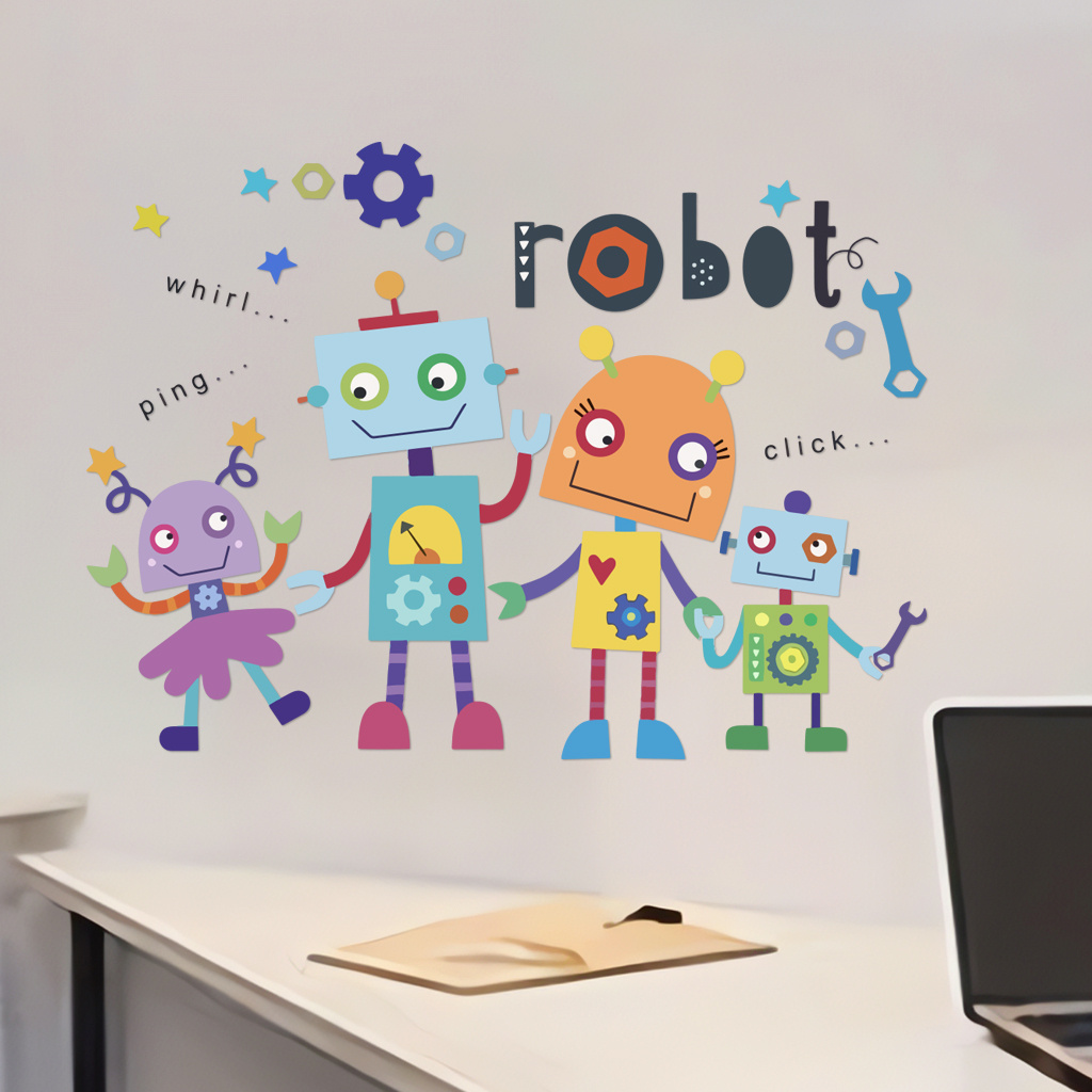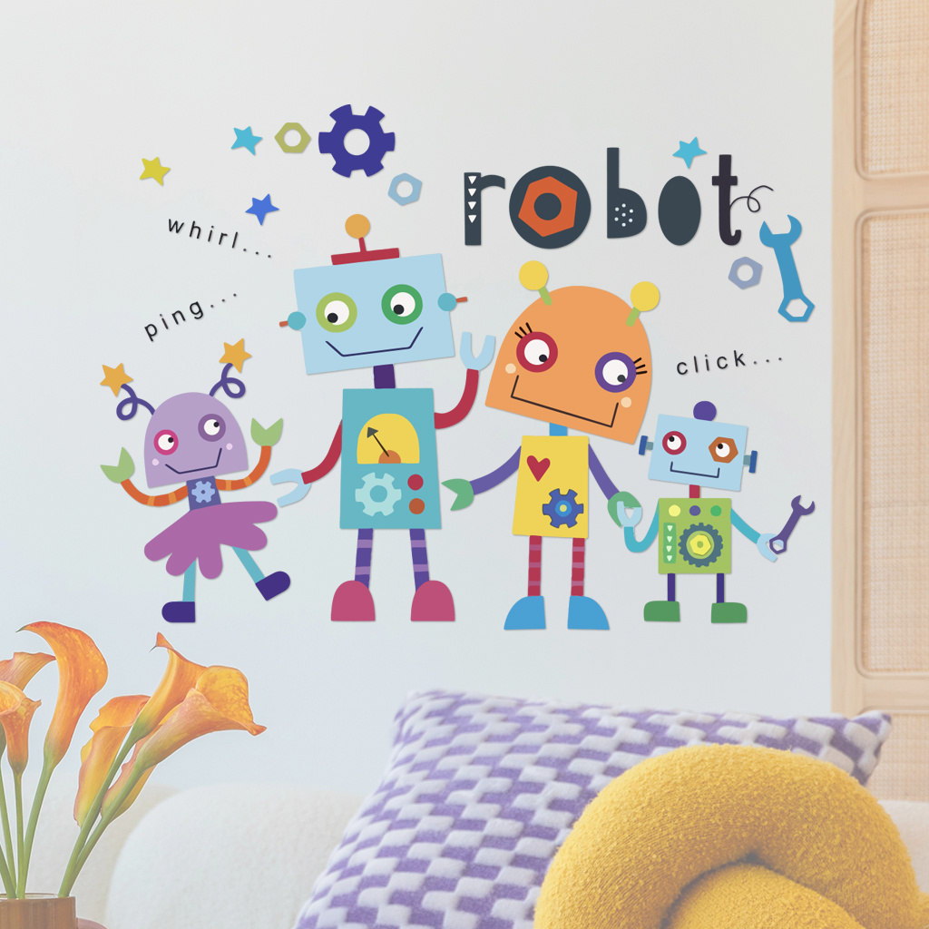 1套 童趣机器人乐园墙贴,多彩卡通机器人组队,配齿轮、“robot” 字样,贴于卧室、游戏区,为空间添科幻童趣氛围与互动感。