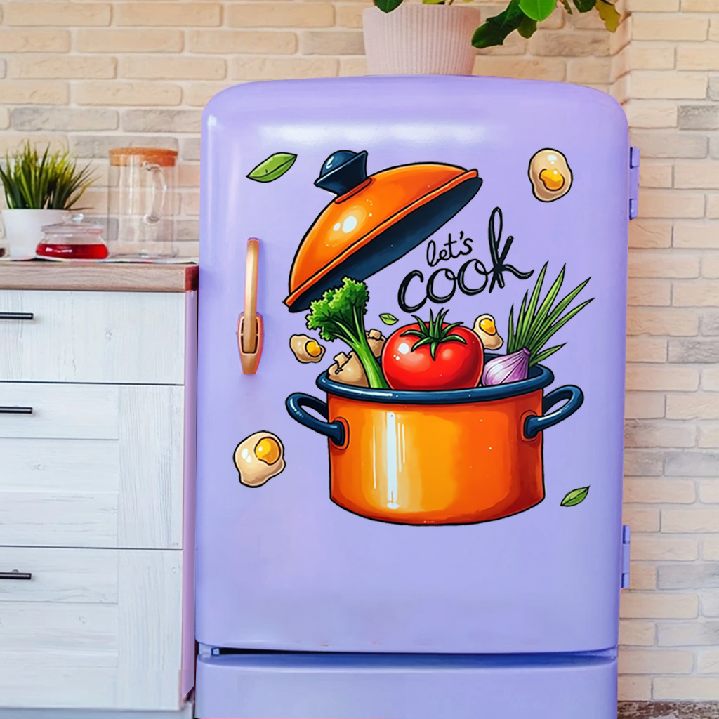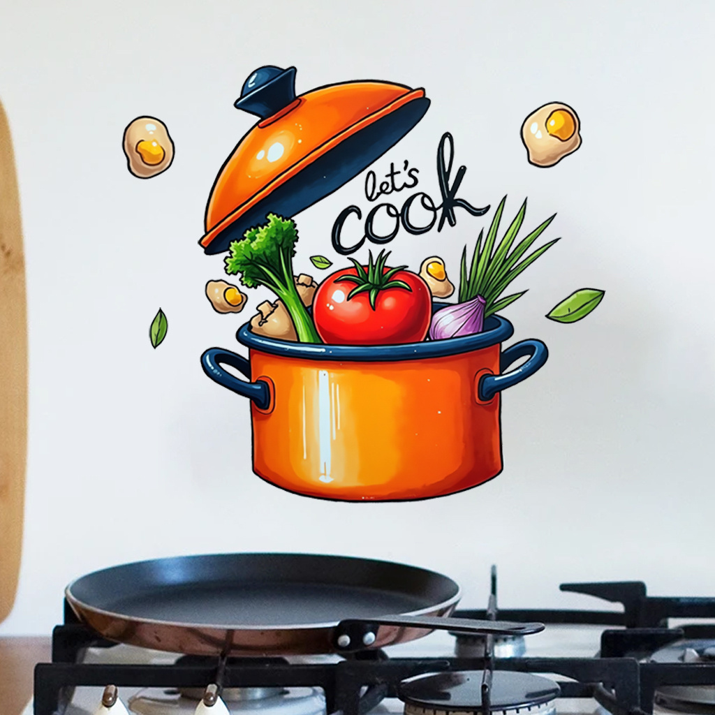 1套 趣味烹饪锅具墙贴,橙色汤锅装满鲜蔬,配 “Let's Cook” 标语,贴于厨房、餐厅,为空间添烹饪活力氛围与创意格调。