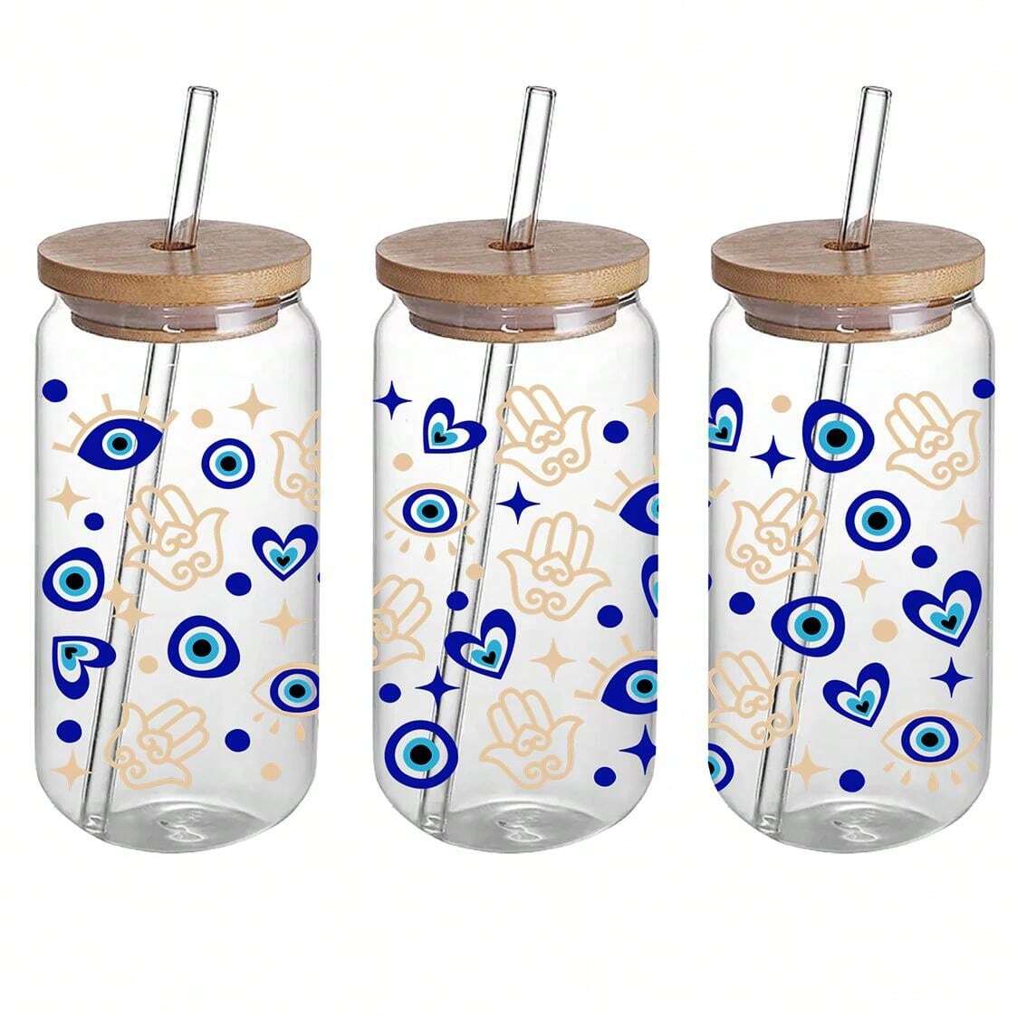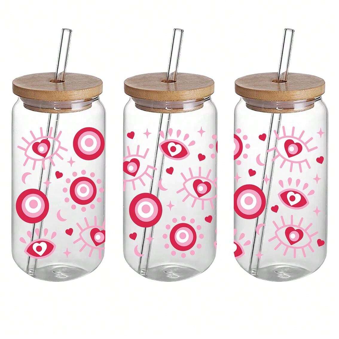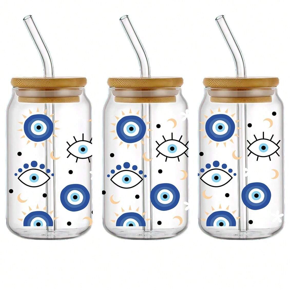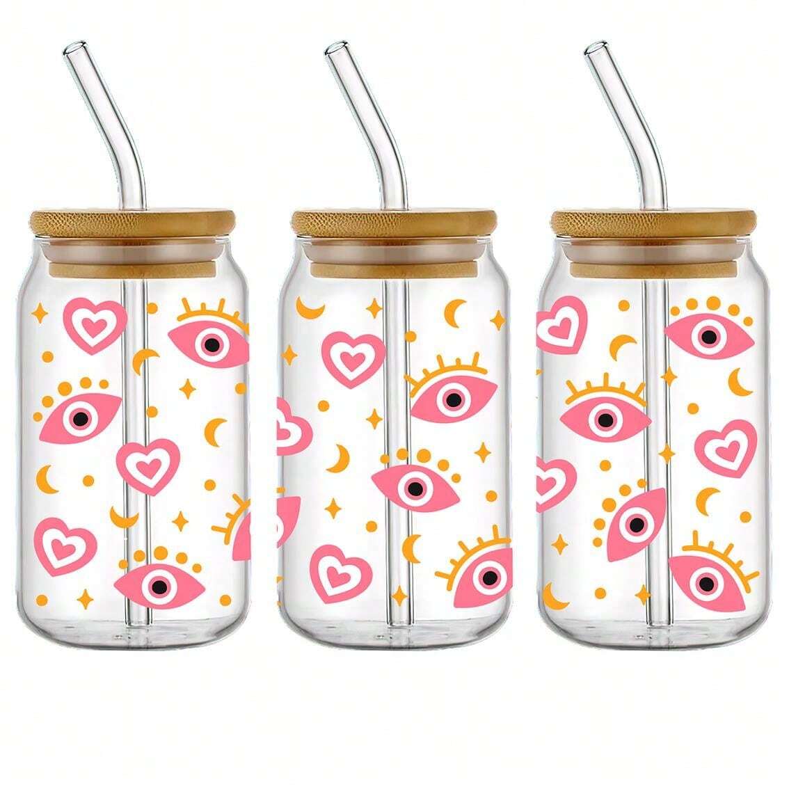 1 set of 5pcs Lucky Pink Blue Eye UV DTF Transfer Printing Waterproof Self-Adhesive Stickers For Mug Water Bottle Cup, DTF Transfer Sticker For 16 OZ Glass Can Wrap, 3d Crystal Label Waterproof And Scratch Resistant, DIY Wrap Transfer Sticker Glass Cup St