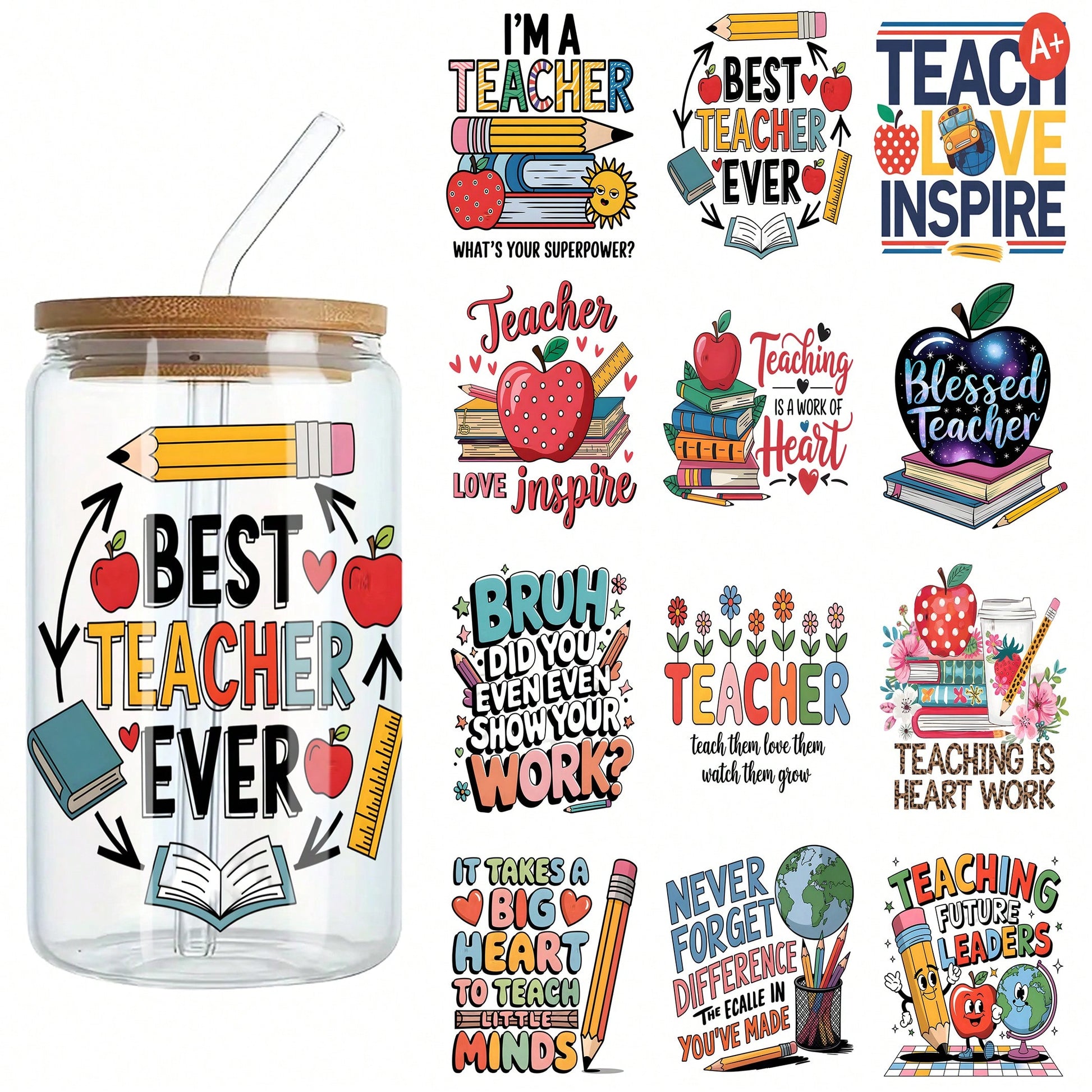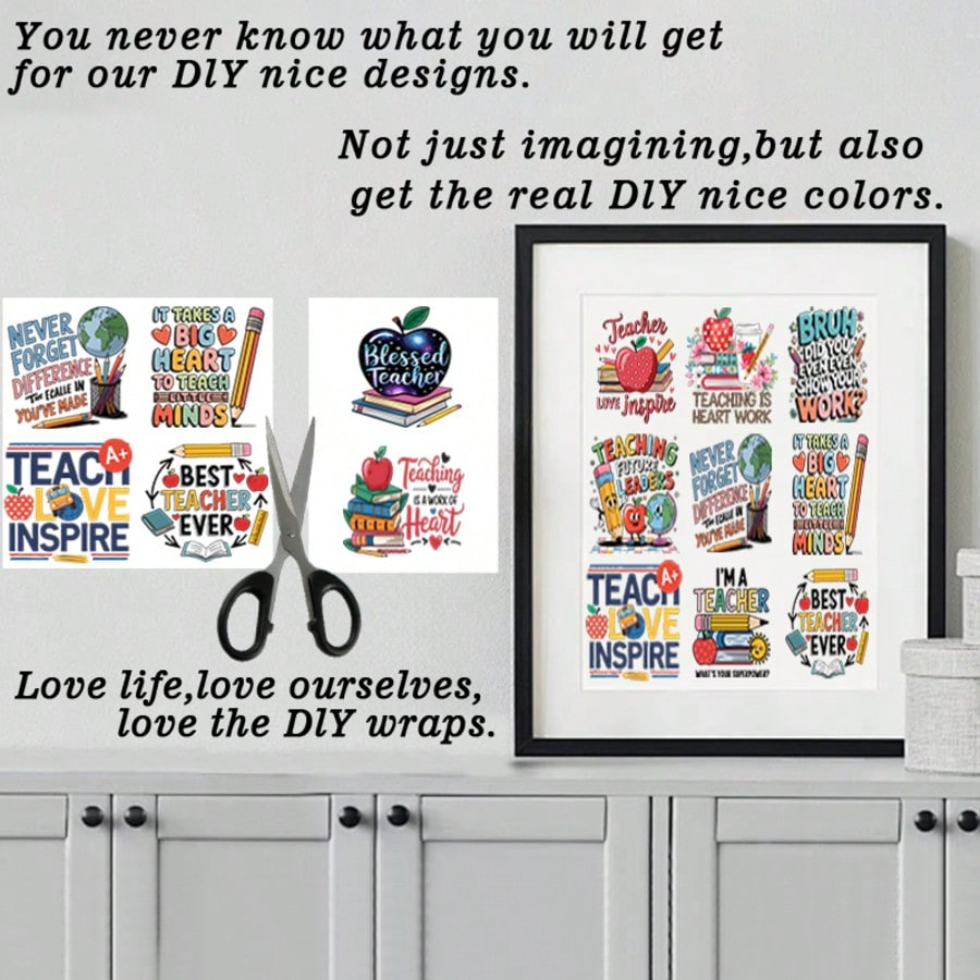 1 set of ELEWINS 12 Sheets UV DTF Cup Wraps For 16oz Tumblers - Teacher Appreciation Insulated Tumbler Wraps Permanent Scratch-Resistant Transfers For Glass & Mugs - Easy-Peel UV DTF Transfers For Smooth Surfaces