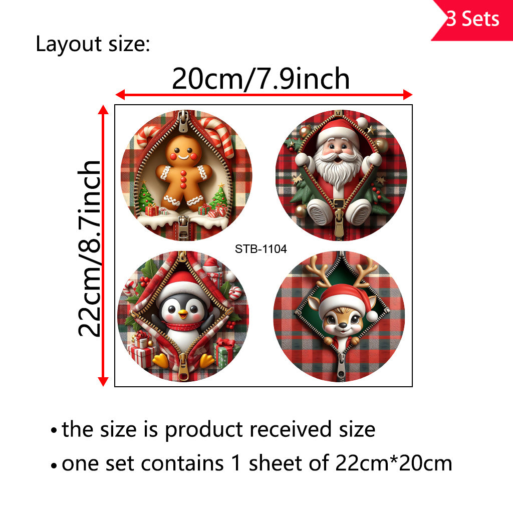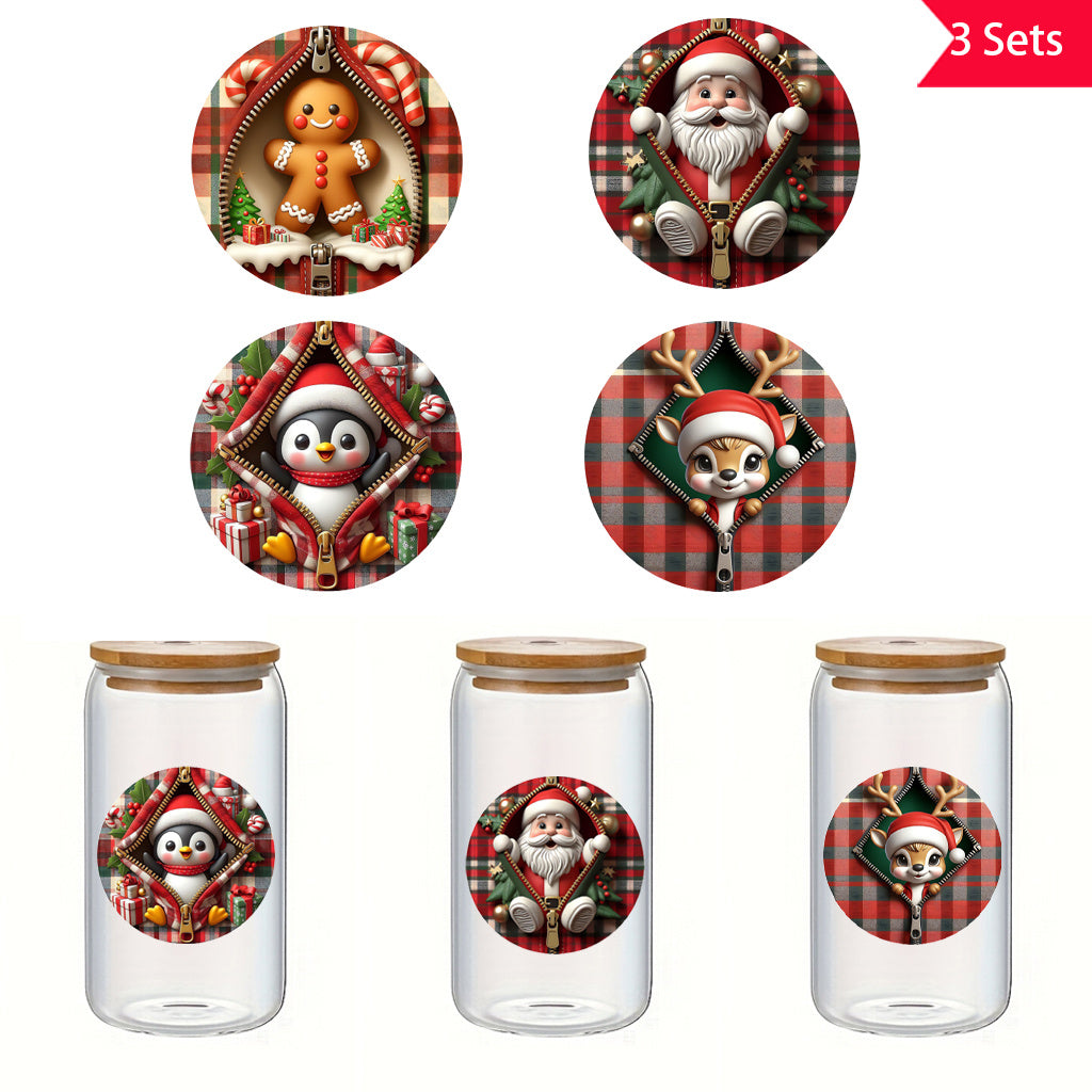 3套 拉链萌趣圣诞UV DTF转印贴纸套装 可爱姜饼人、慈祥圣诞老人、俏皮小企鹅与萌态驯鹿破格而出,为你的生活装点浓郁圣诞氛围